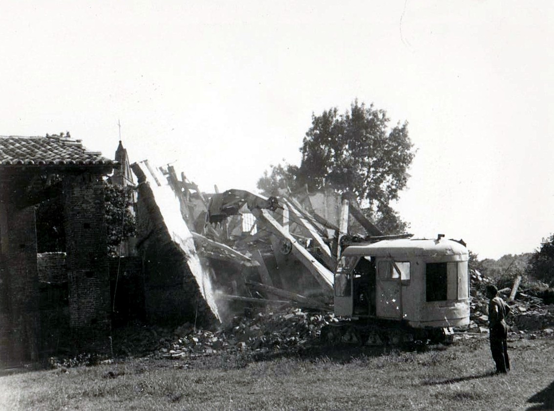Démolition partie habitation dépendances faisant suite au hangar, l'église est en face.