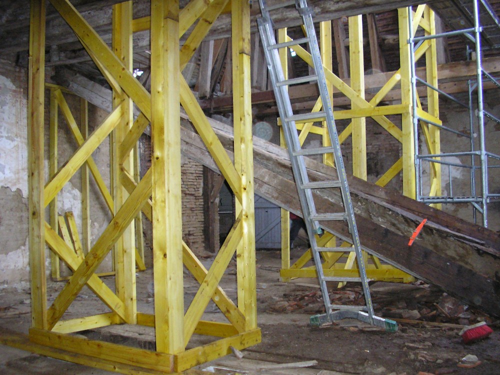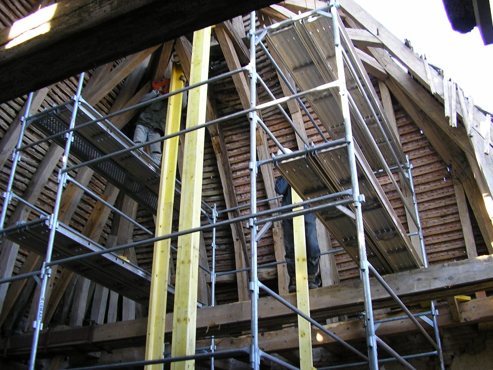 Mise en place de l'étayage et échafaudages à l'intérieur des combles