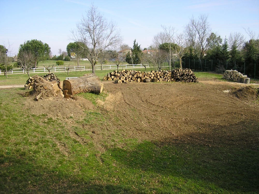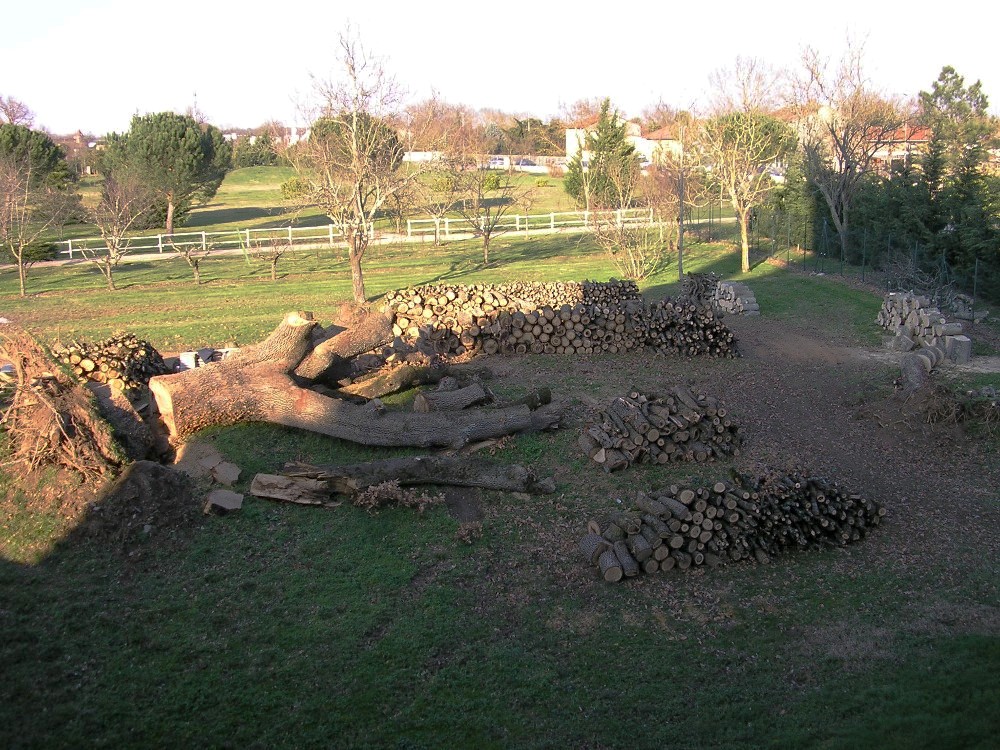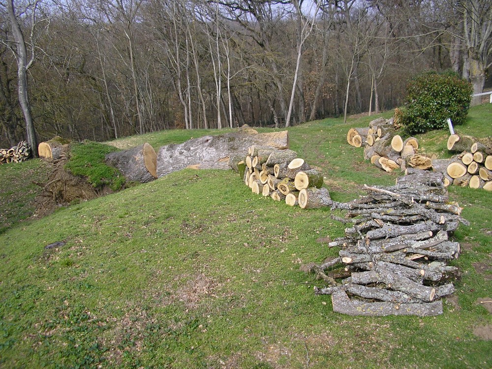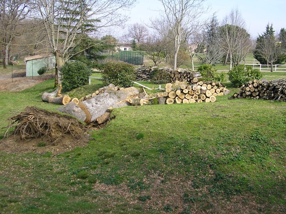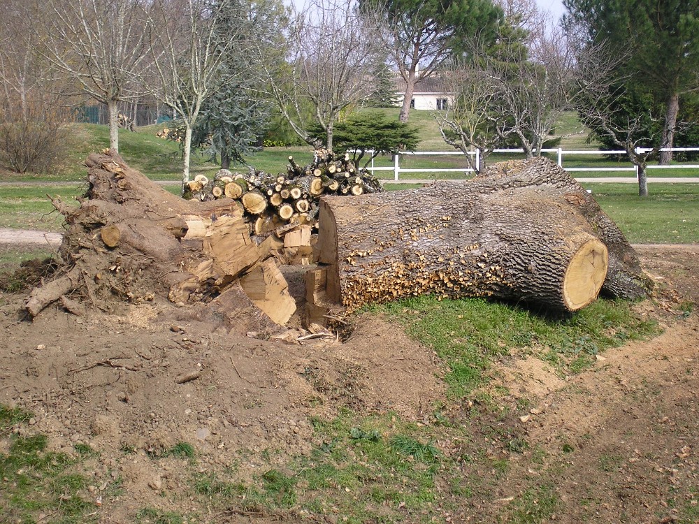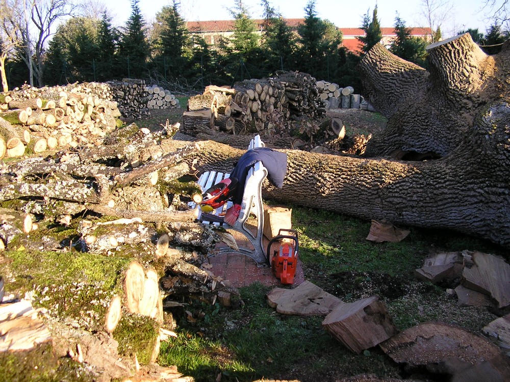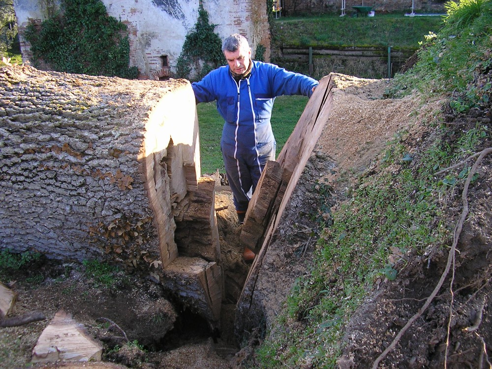 Le chêne dans sa magnificence, et après ![]() Monsieur de Laburthe, propriétaire, a joint le message ci-dessous, aux photographies montrant le débitage des chênes : "Le gros chêne à gauche du château (côté village) avait un tronc de 1,40 x 1,70m (sa section était sensiblement rectangulaire) à sa base, le houppier une fois débité avec les branches charpentières représente 30 m3 de bois, la souche avait un diamètre hors sol de 4m. Le mode d'extraction retenu a été de travailler cet